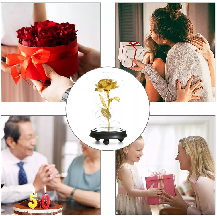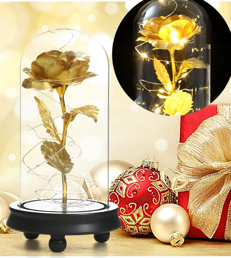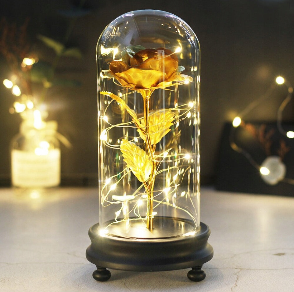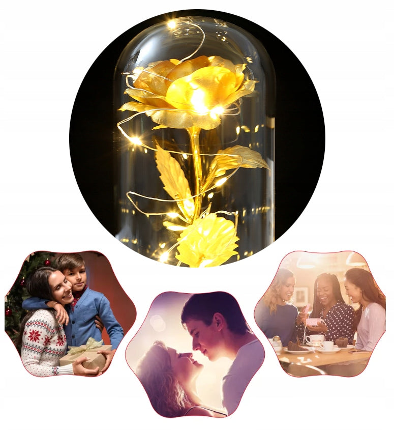 Ši preciziškai pagaminta rožė, meilės simbolis, įdėta į gražų stiklinį kupolą, pro kurį visą laiką, net ir tamsoje, matosi jos grožis, nes ją apšviečia 20 šiltai baltos spalvos LED lempučių , kurios su juo pinama.