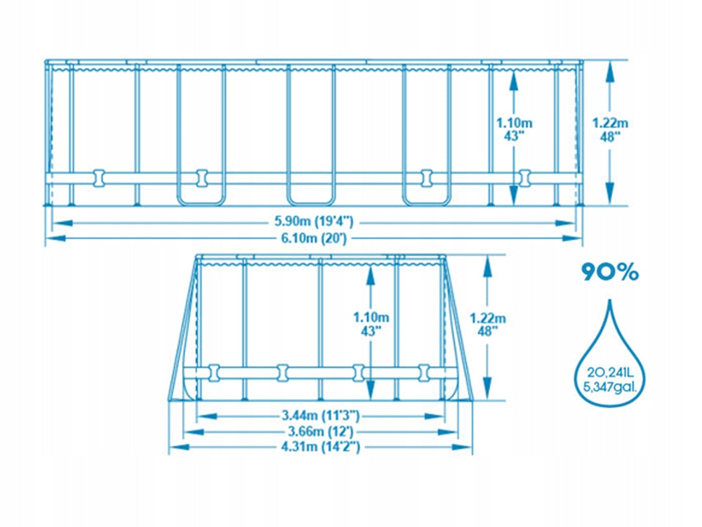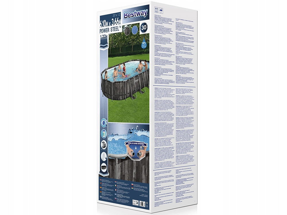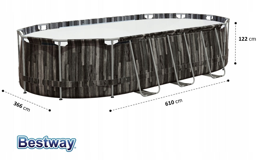 1. RĖMAS BASEINAS - Bestway Power Steel baseinas , dydis 610 cm x 366 cm x 122 cm - talpa 20 241 l. Gamintojas nurodo vandens pripildymą maksimaliu 90%.