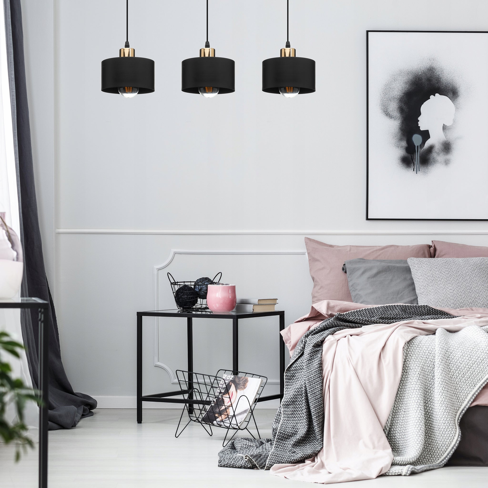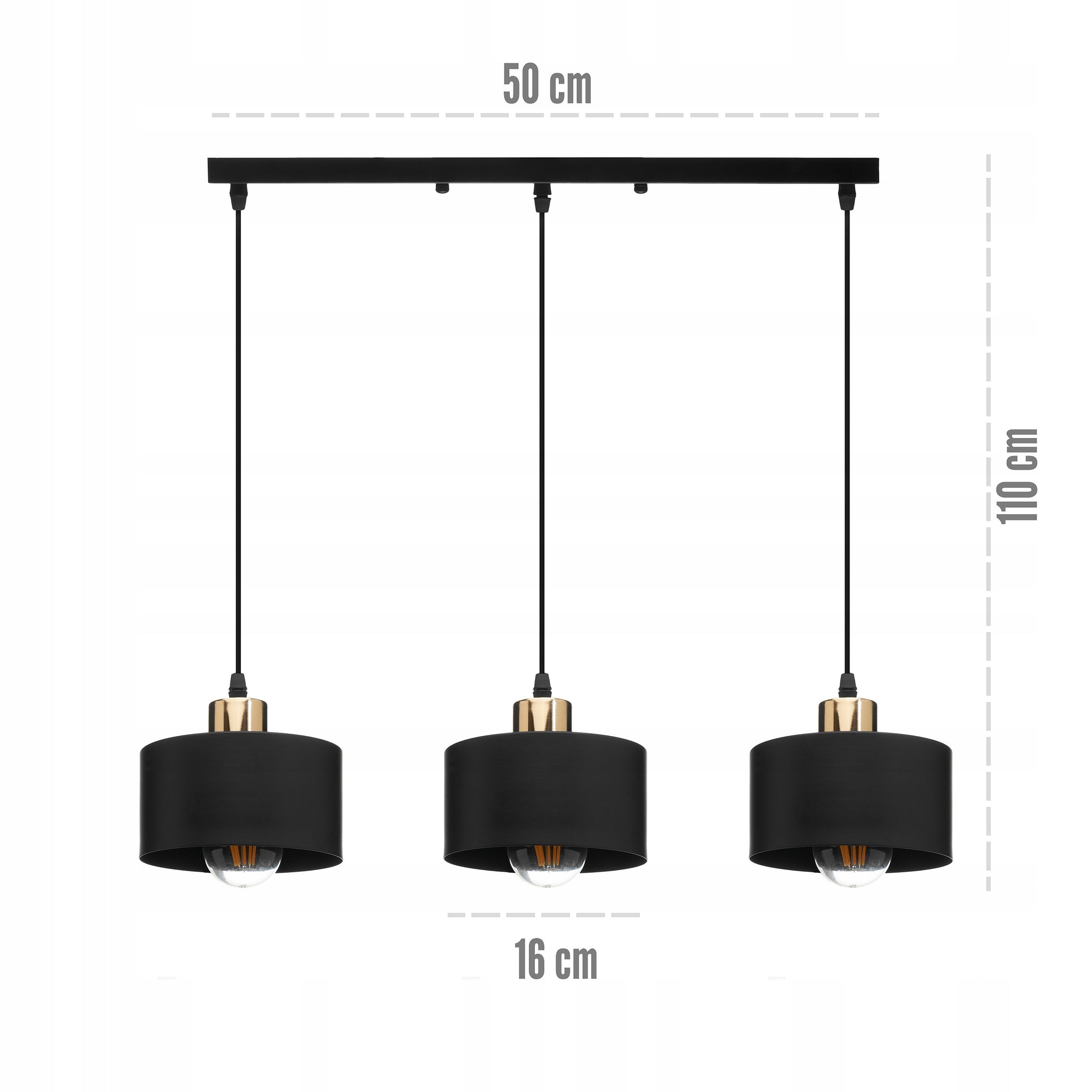 Modernus pakabinamas šviestuvas yra tikros elegancijos pavyzdys. Jis žavi savo paprastumu, bet užburia auksine apdaila. Tai idealus pakabinamas šviestuvas valgomajam ir svetainei, nes sukurtas pailgos, 3 taškų formos, todėl stalą ar kambarį šiuo šviestuvu galima apšviesti visu paviršiumi. Kiekvieno iš trijų šviestuvų gaubtų paviršius dekoruotas klasikine juoda spalva, kuri ne tik teigiamai veikia išvaizdą, bet ir suteikia šviesos efektui ekstravagantišką natą bei darniai pabrėžia romantišką atmosferą. Su šiuo šviestuvu galite lengvai pagyvinti savo namų interjerą.