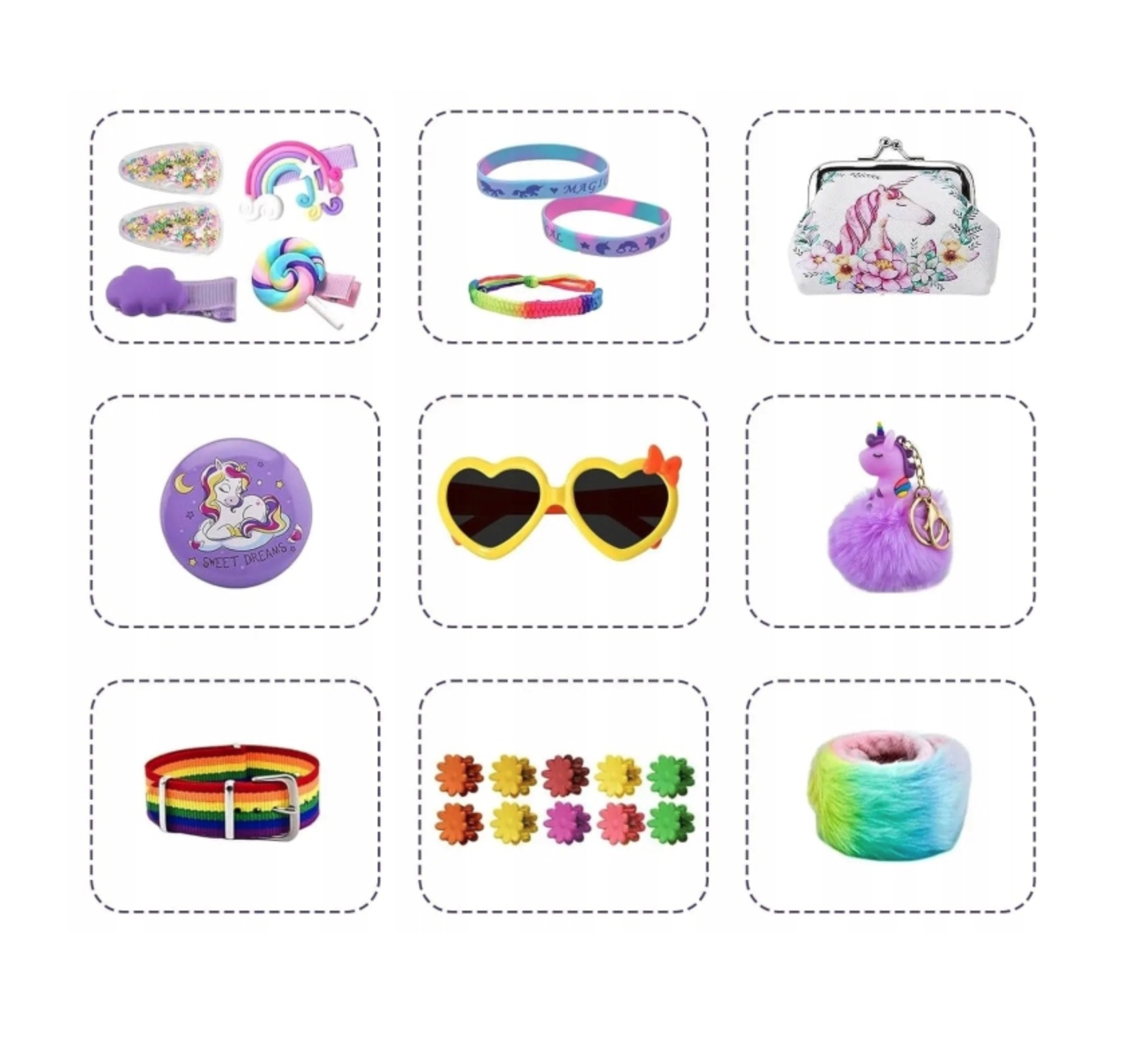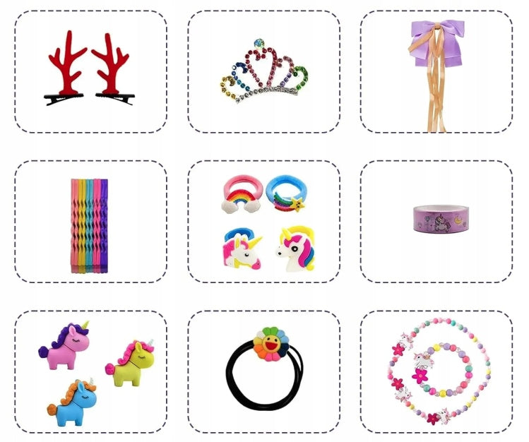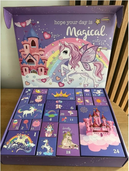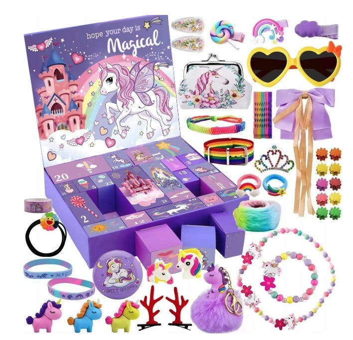 Meitenēm paredzētajā Vienradža Adventes kalendāra kastītē ir 24 pārsteigumi, kas skaita atpakaļ līdz Ziemassvētku dāvanām, tostarp vienradža soma, matu sprādzes, matu aksesuāri, bērnu rotaslietu komplekti, saulesbrilles, rokassprādzes, atslēgu piekariņi un citi.