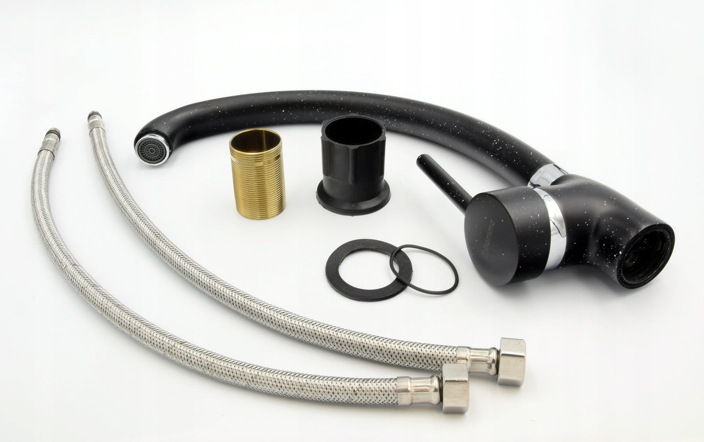 Komplektā ietilpst: jaucējkrāns, blīves, uzstādīšanas komplekts, šļūtenes