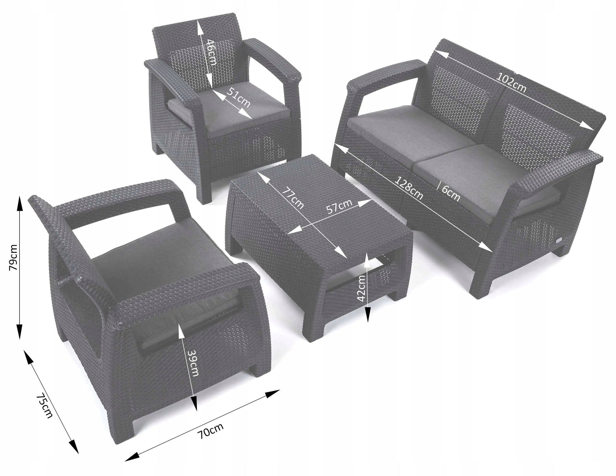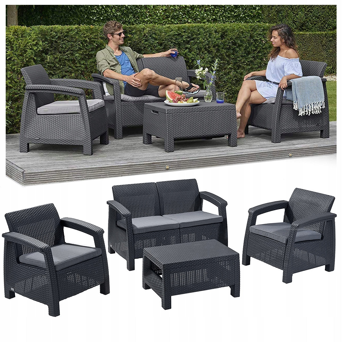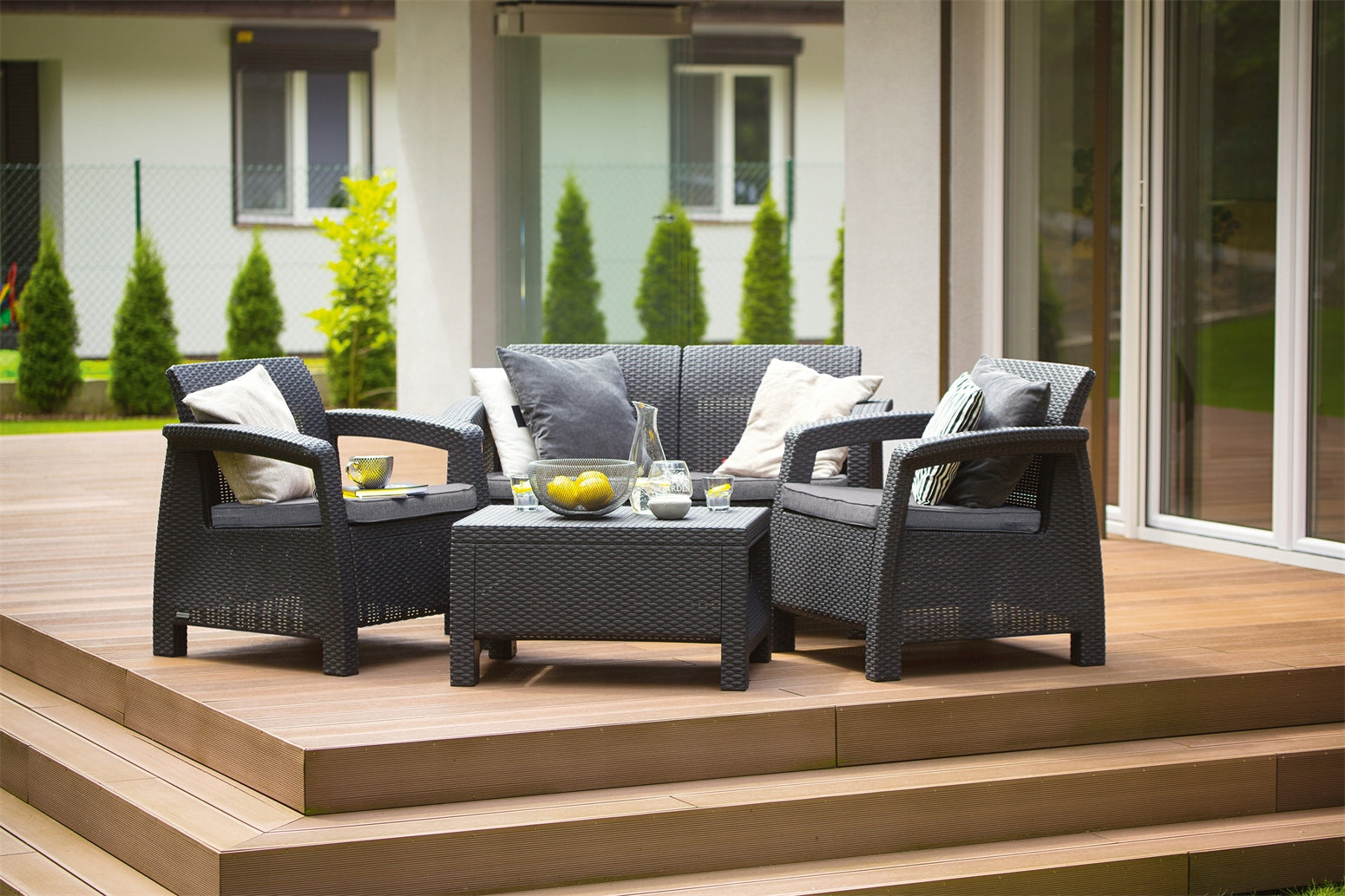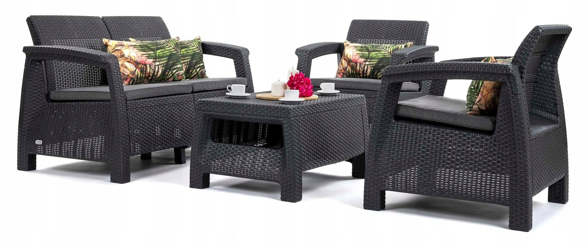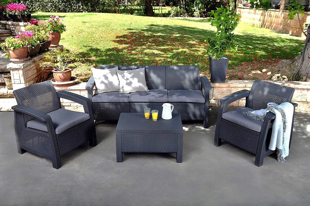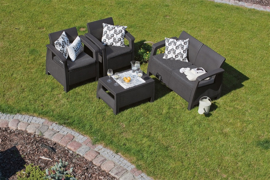 Elegantais 4 personu tumšā grafīta Corfu mēbeļu komplekts ir ideāli piemērots klasiskam dārzam un balkonam.