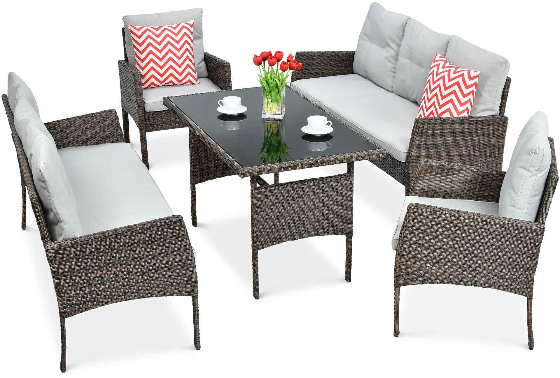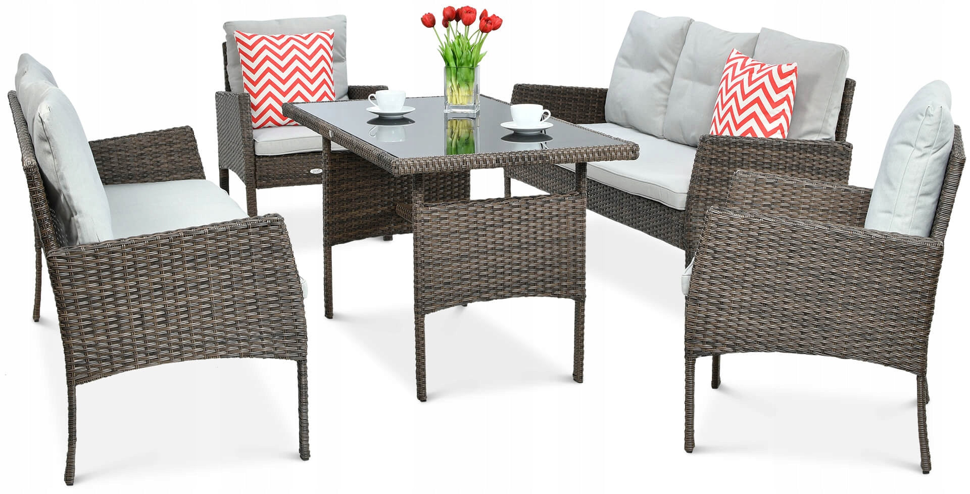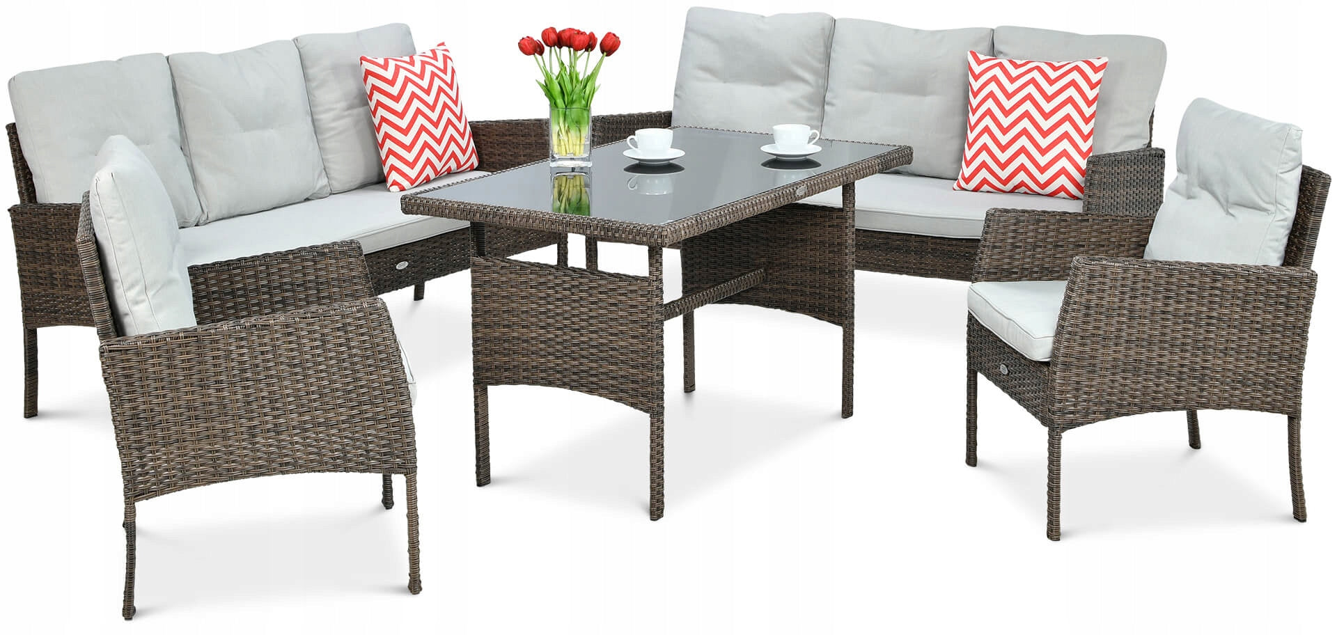 CORTINA FAMILY brūnais dārza mēbeļu komplekts ir atbilde uz visaugstākajām klientu prasībām – tas apvieno izturību, stiprību un estētiku ar pieejamu cenu. Komplekts ir izgatavots no augstas kvalitātes rotangpalmas un austs uz stabilas tērauda konstrukcijas, padarot to stabilu un izturīgu pret nelabvēlīgiem laikapstākļiem. Tas būs lieliski piemērots gan iekštelpām, gan ārā – jebkuros laikapstākļos! Komplektā var izmitināties 8 cilvēki: tas sastāv no diviem trīsvietīgiem dīvāniem, diviem atpūtas krēsliem un praktiska ēdamgalda, kas pārklāts ar rūdītu stiklu, no kura var ātri un efektīvi notīrīt visus netīrumus. Sēdekļiem un atzveltnēm ir ērti spilveni, kas palielina komfortu ikdienas dzīvē. Spilvenu pārvalkiem ir rāvējslēdzēji, tāpēc tos ir viegli uzturēt tīrus – vienkārši noņem un izmazgā. CORTINA FAMILY komplekts ir gan funkcionāls, gan elegants.