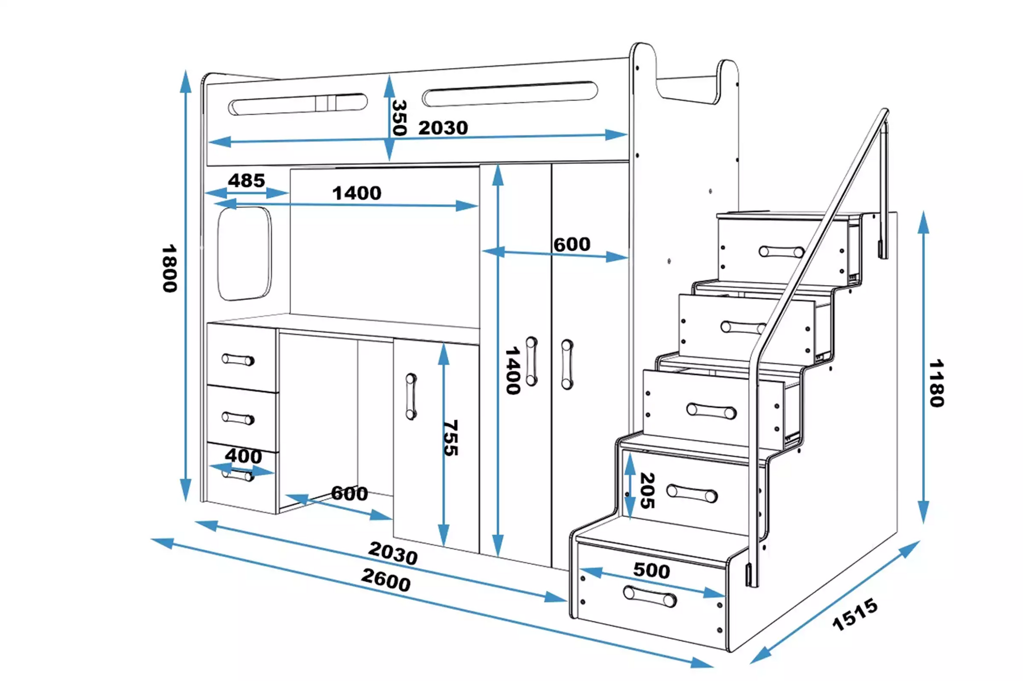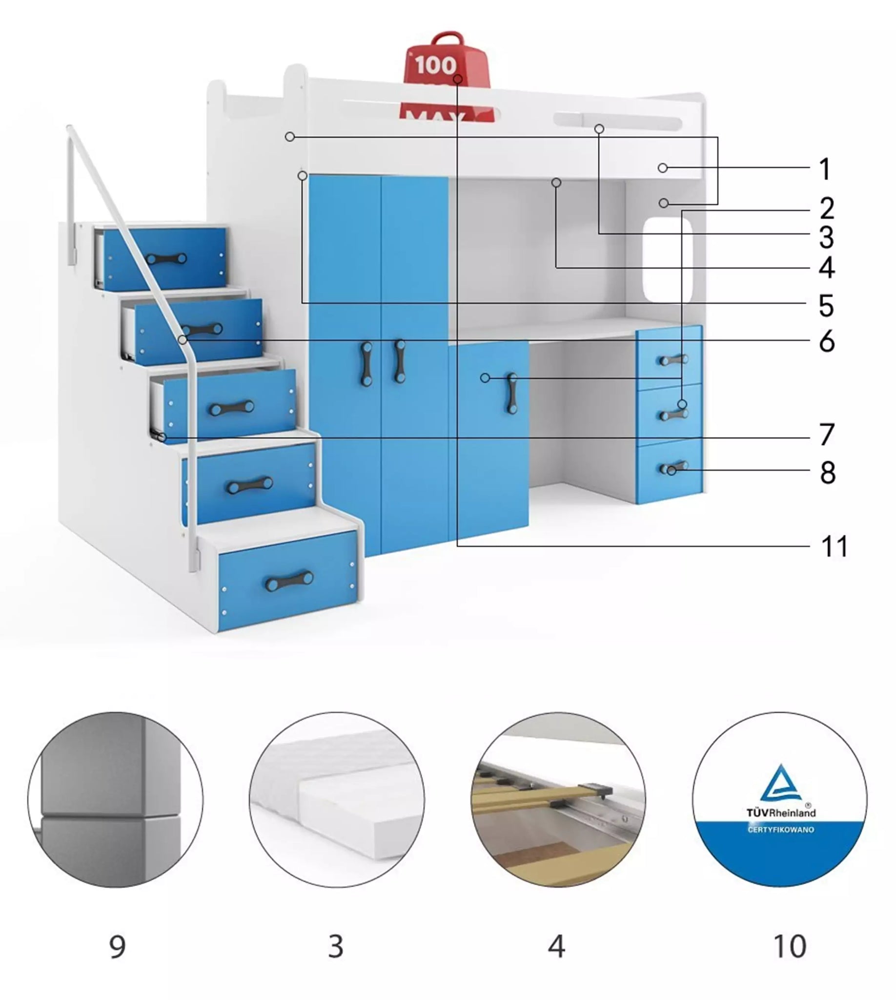 Gulta, rakstāmgalds, skapis un atvilktnes skolas piederumu, rotaļlietu un drēbju glabāšanai vienā? Jā! Šī ir bērnu divstāvu gulta, pateicoties kurai jūs varat iekārtot praktisku telpu mācībām, spēlēm un atpūtai bērna istabā. Tas ir ļoti funkcionāls risinājums, ko novērtēs visi vecāki. Detaļām pievērstā uzmanība un atsevišķo komponentu augstā kvalitāte rada ērtu guļvietu un organizētu telpu mantām un mācībām.